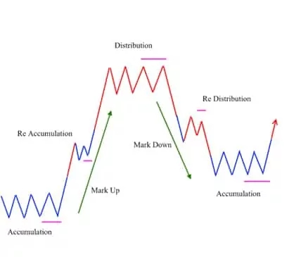 It is the cycle in which the markets move up and down through various stages such as Accumulation – Mark Up – Distribution – Mark Down and sometimes the intervening stages of Re-accumulation and Re-distribution.